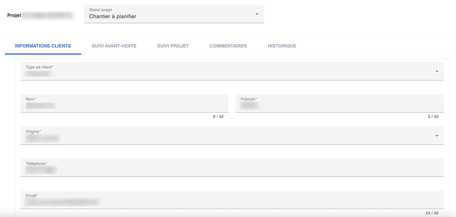 L’objectif était d’outiller les collaborateurs pour centraliser et structurer le parcours client de bout en bout, du premier contact à la finalisation du chantier, et pour fluidifier les échanges entre les équipes (commerciales, administratives, techniques et direction).